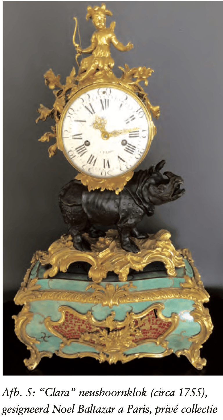 met voorstellingen van de toen minder bekende dieren die daar leefden. Voorstellingen waarop olifanten voorkomen werden al gebruikt sinds de Renaissance, maar afbeeldingen op klokken van neushoorns, kamelen en dromedarissen waren minder gewoon.
