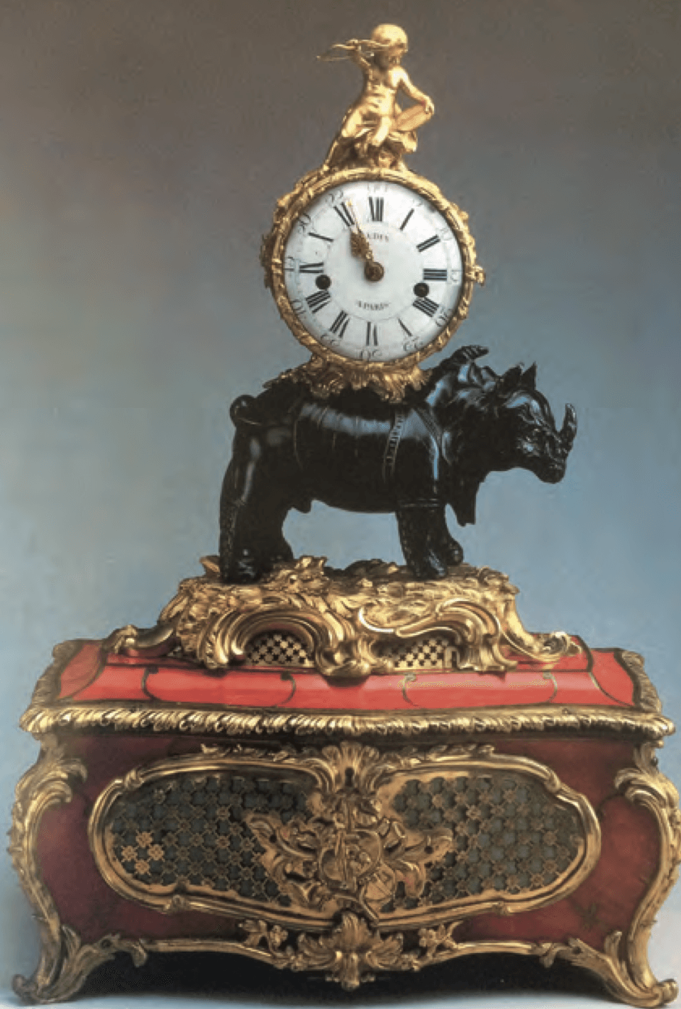 Halverwege de 18de eeuw kwamen er neushoornklokken op de markt. Er zijn twee typen klokken gemaakt. De eerste toont een neushoorn met schild en latere periodes is er geen harnas meer aanwezig en ook de onnatuurlijke hoorn op de rug is verdwenen. De bekende bronzeur Jean-Joseph de Saint Germain (1719-1791) was een belangrijke maker van neushoornklokken. Hij creëerde meerdere typen. Soms staat de neushoorn in tegenovergestelde positie of zit er een Chinese figuur op de klok in plaats van de Indiase. Er zijn ook identieke exemplaren bekend als de hier onder beschreven, maar dan zonder speelwerkbasement. Vergelijkbare exemplaren komen zelden te koop (de laatste werd in 1985 in New York geveild) en bevinden zich bijna uitsluitend in musea waaronder het Louvre in Parijs.